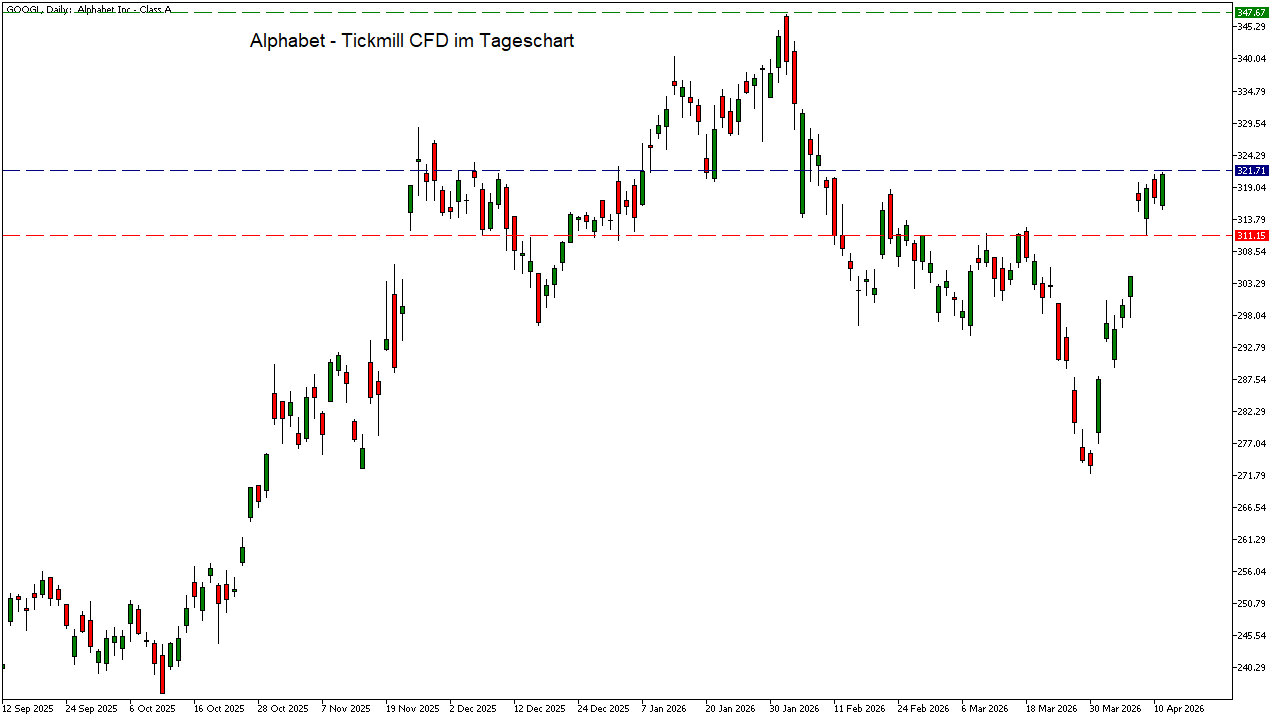 Im Gegensatz zu Microsoft zeigt sich Alphabet deutlich robuster. Die Aktie notiert über dem 200-Tage-Durchschnitt und hat den vorherigen Abwärtstrend bereits hinter sich gelassen. Aktuell konsolidiert der Kurs auf hohem Niveau – ein klassisches bullisches Zeichen.